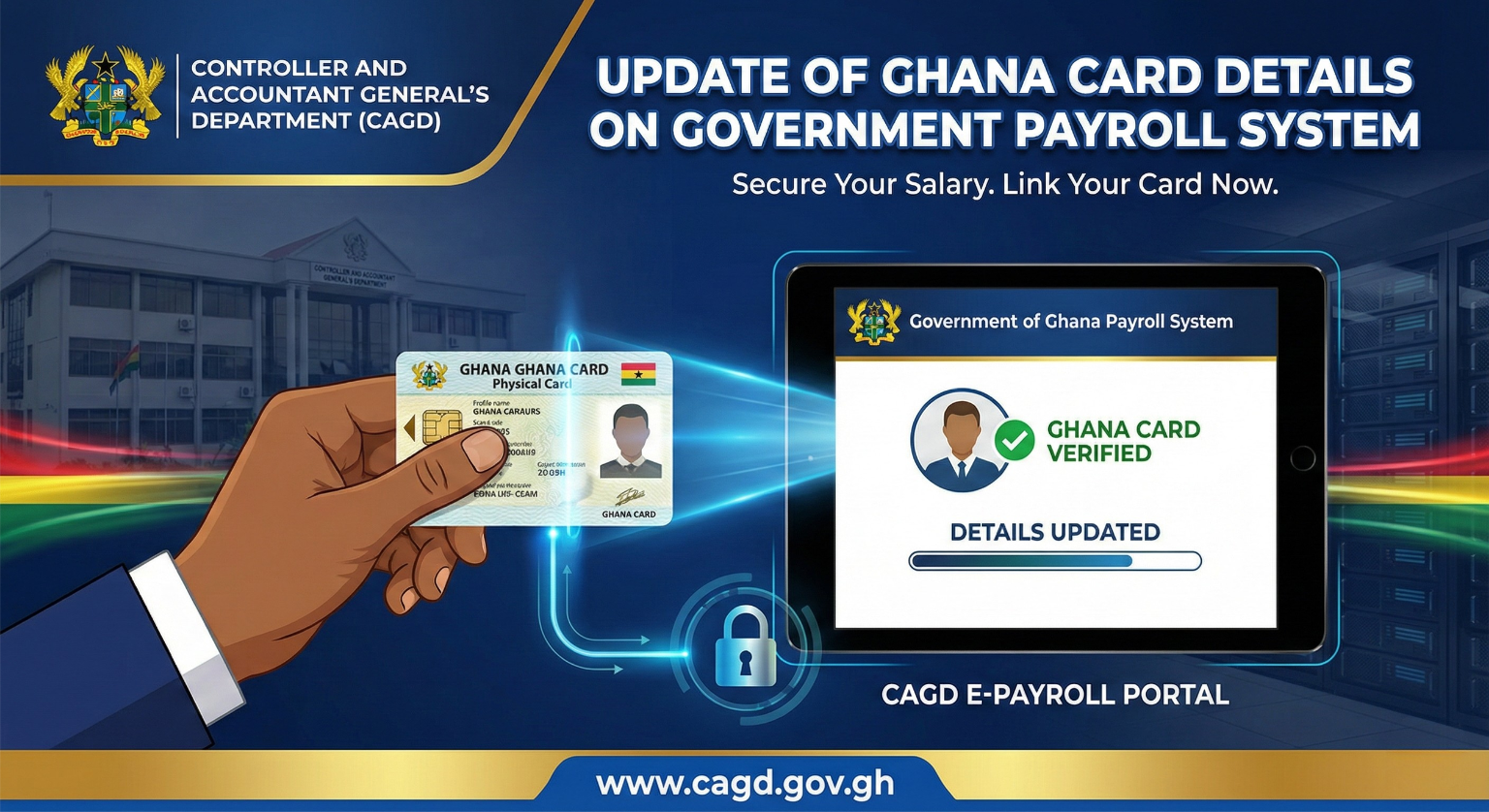 The Controller and Accountant-General’s Department (CAGD) wishes to remind all Government employees of Covered Entities to update the details of their Ghana Card on the Government of Ghana Payroll System.